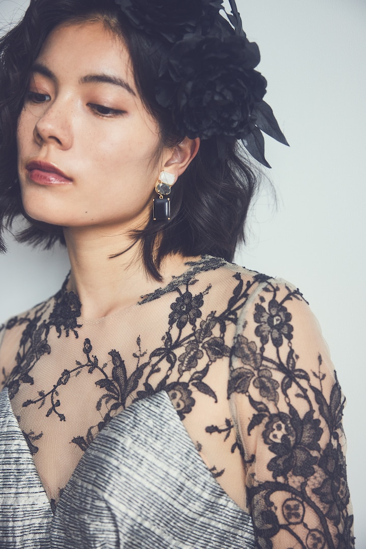 デコルテに浮かび上がるようなイリュージョンなフランス製のブラックレース