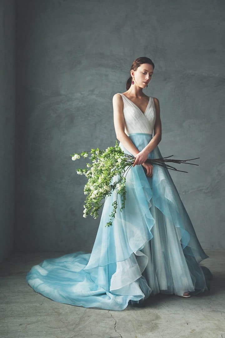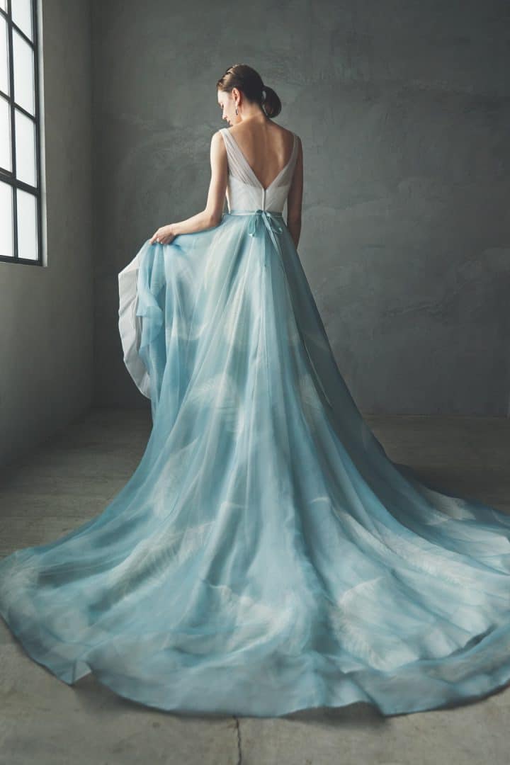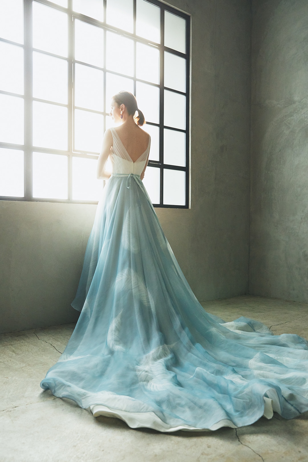 オリジナルで染めた透明感溢れるオーガンジーは、歩みを進めるたびにふんわりと舞う。