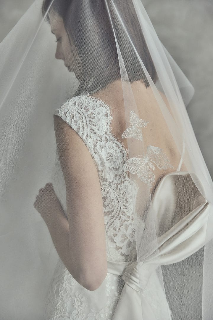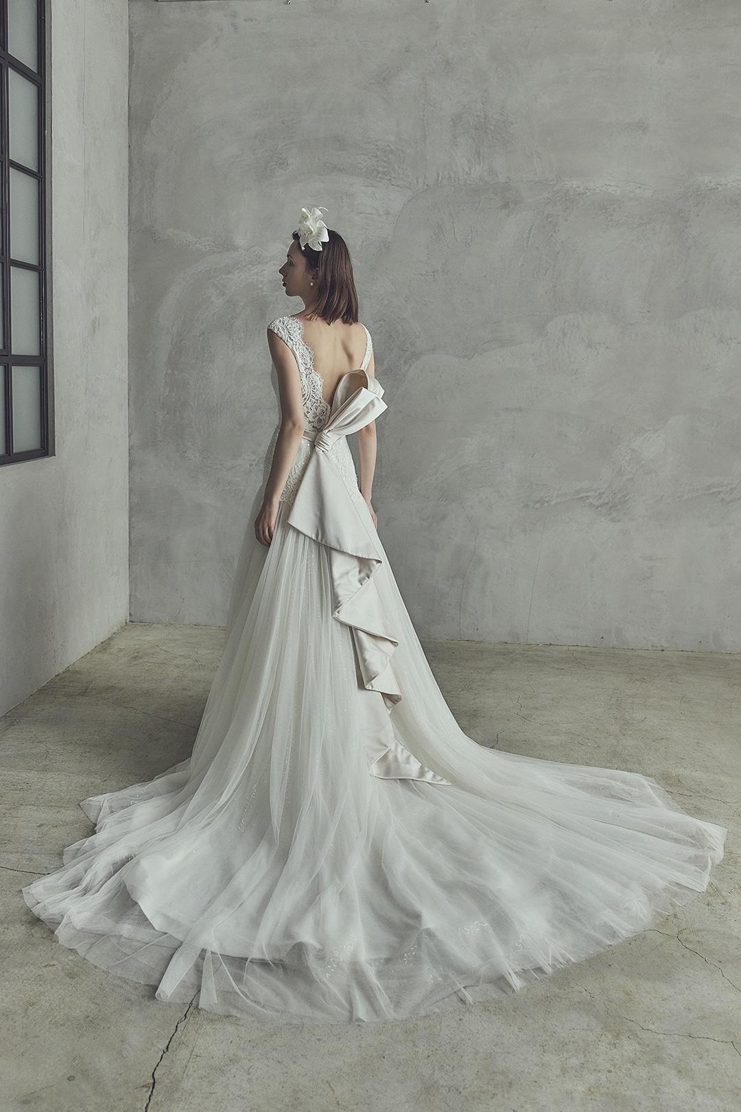 大胆に見せた背中には、立体感のあるバックリボンを。
