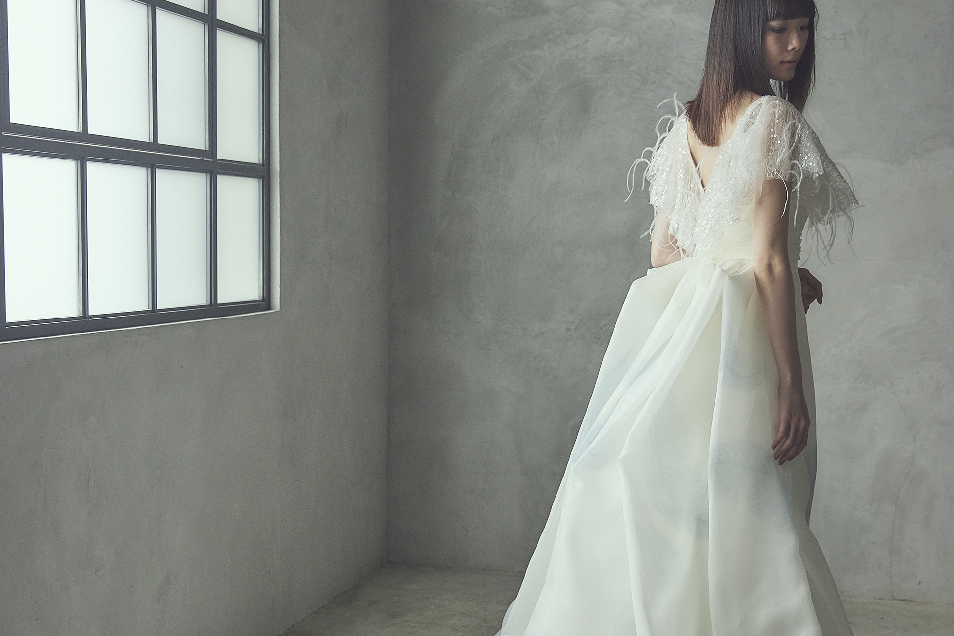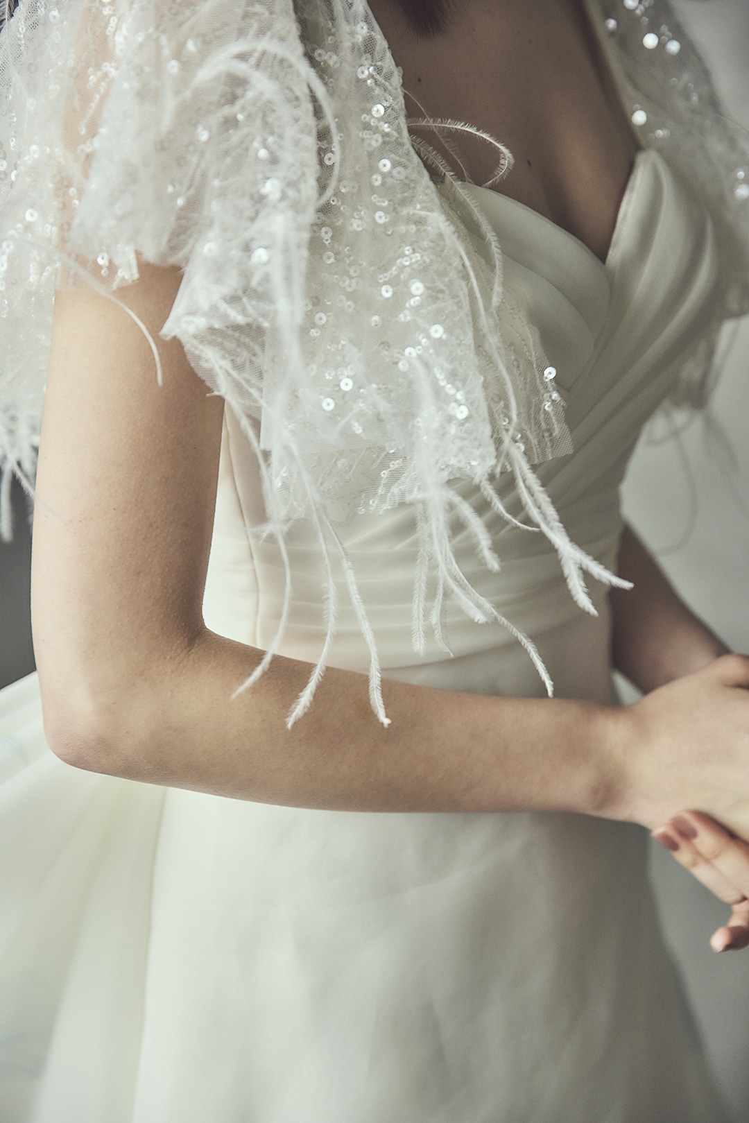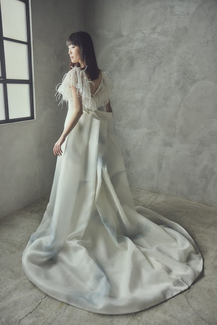 ショルダーデザインは、羽根のようなモチーフが風にそよぎ、光を受けてスパンコールが煌めく。