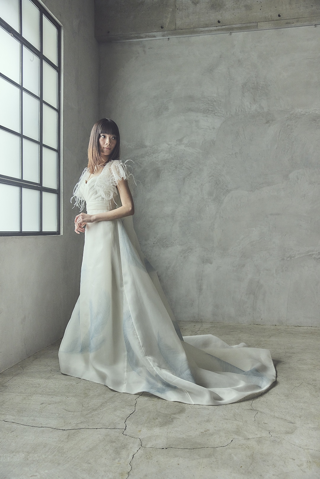 繊細に描かれた羽根が空に舞うように施されたスカート。
