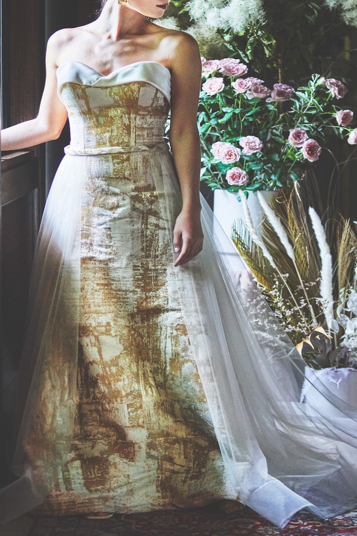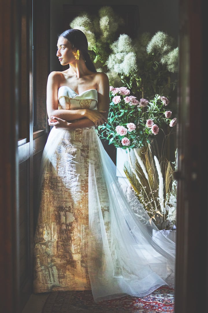 老舗〈細尾〉の西陣織りを全身に贅沢に取り入れたドレス。