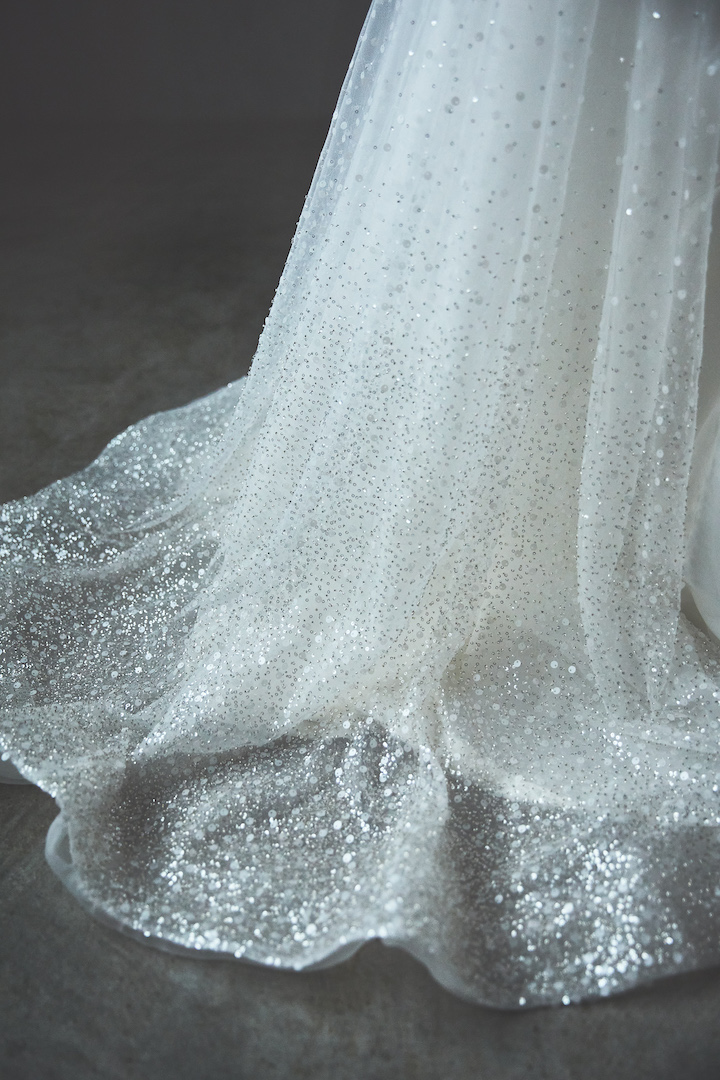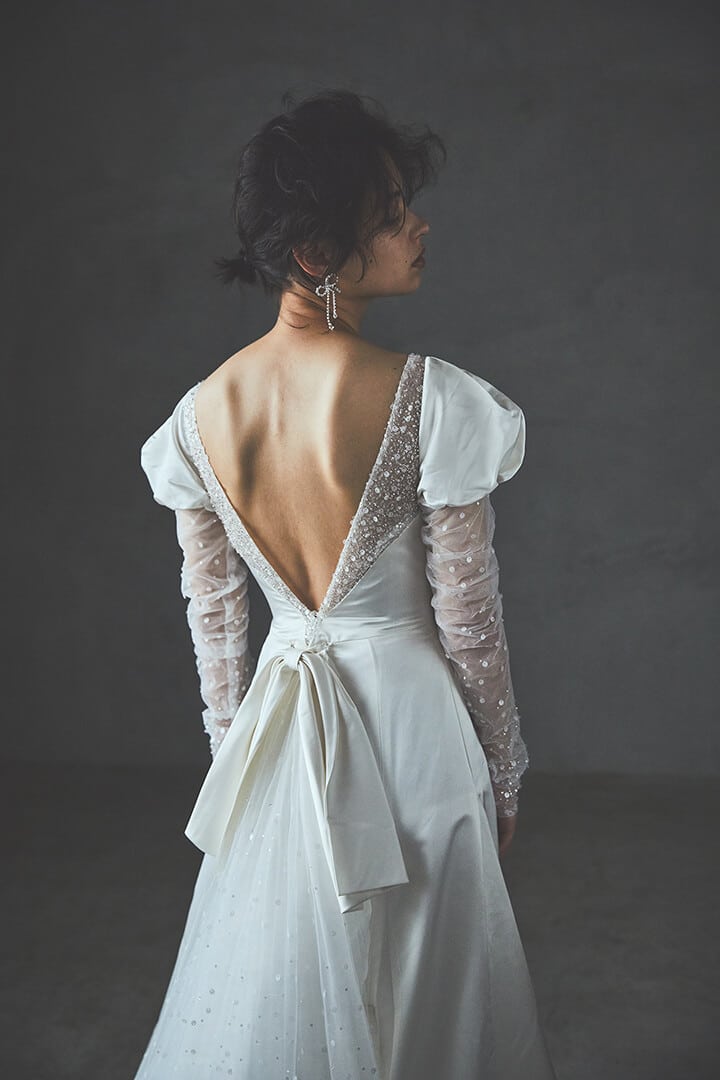「Milky way=天の川」と名付けられたこのドレスは、フロントは、イギリス製の上質なマテリアルだからこそ放たれる光沢感を生かしたシンプルなデザイン。一方、立ち去り姿は、天の川のような「煌めきのグラデーション」をトレーンに従えて、ドラマティックなフロントとのギャップを感じられるデザインに。煌めきのスリーブを纏えば、指輪交換やケーキカット、感謝のお手紙を読む際の手元を美しく煌めきで演出してくれる。