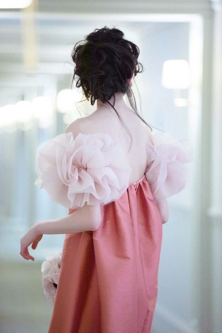 Peri 特別な1日に、ときめきと自信を。 表裏ツートーンカラーのミカド素材を使用。 フリルの中心には、ピンクパールとギャザリングしたチュールのディティールが心をときめかせます。 アンクル丈のスカートからはドレスカラーとマッチングさせたシューズやネイルを覗かせて。 ショルダーとバックデザインはそれぞれ取り外しが可能です。 ご試着予約