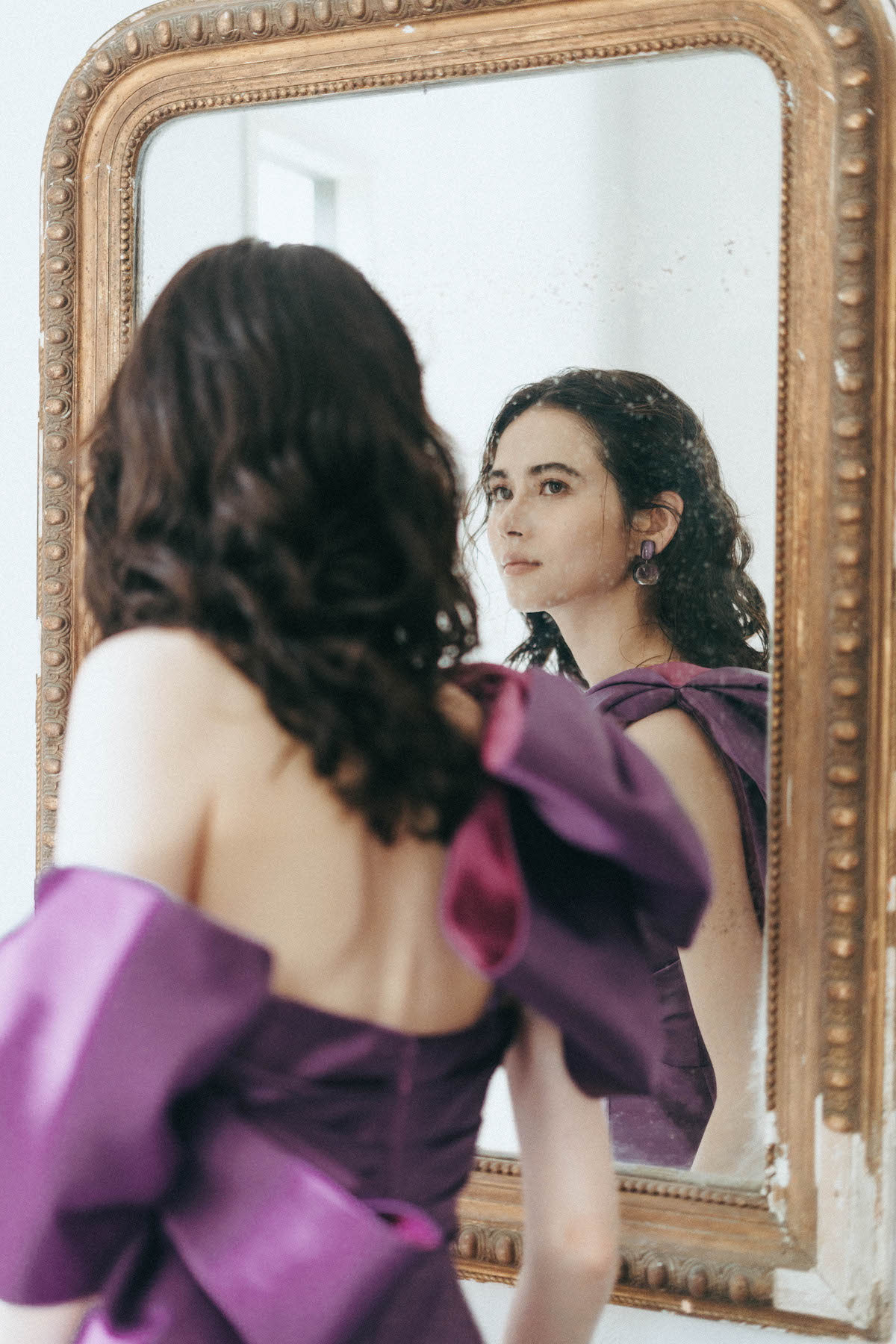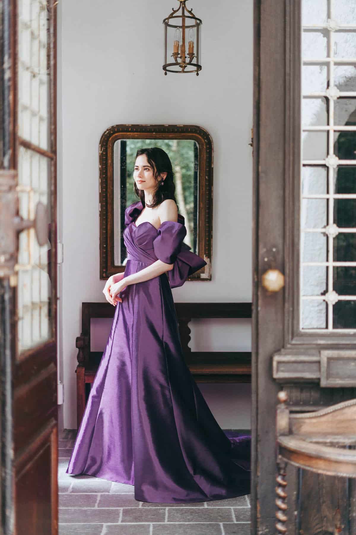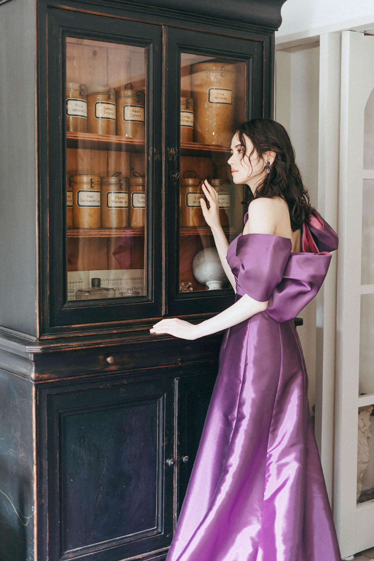 Plum バイカラーのイタリア製のミカドを使ったソフトマーメイド。MUSUBIモチーフを肩上と左脇の腕に通すことで優美でなだらかな斜めのラインが描かれる。ヒップラインを出しすぎず足元に向かって広がるマーメイドラインは、身体のシルエットを美しく演出し、存在感を引き立てます。 ご試着予約