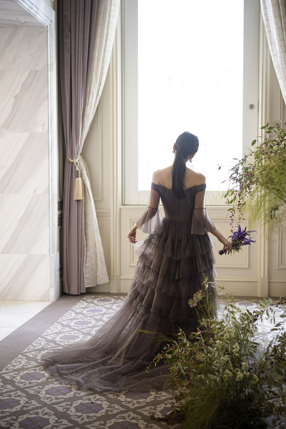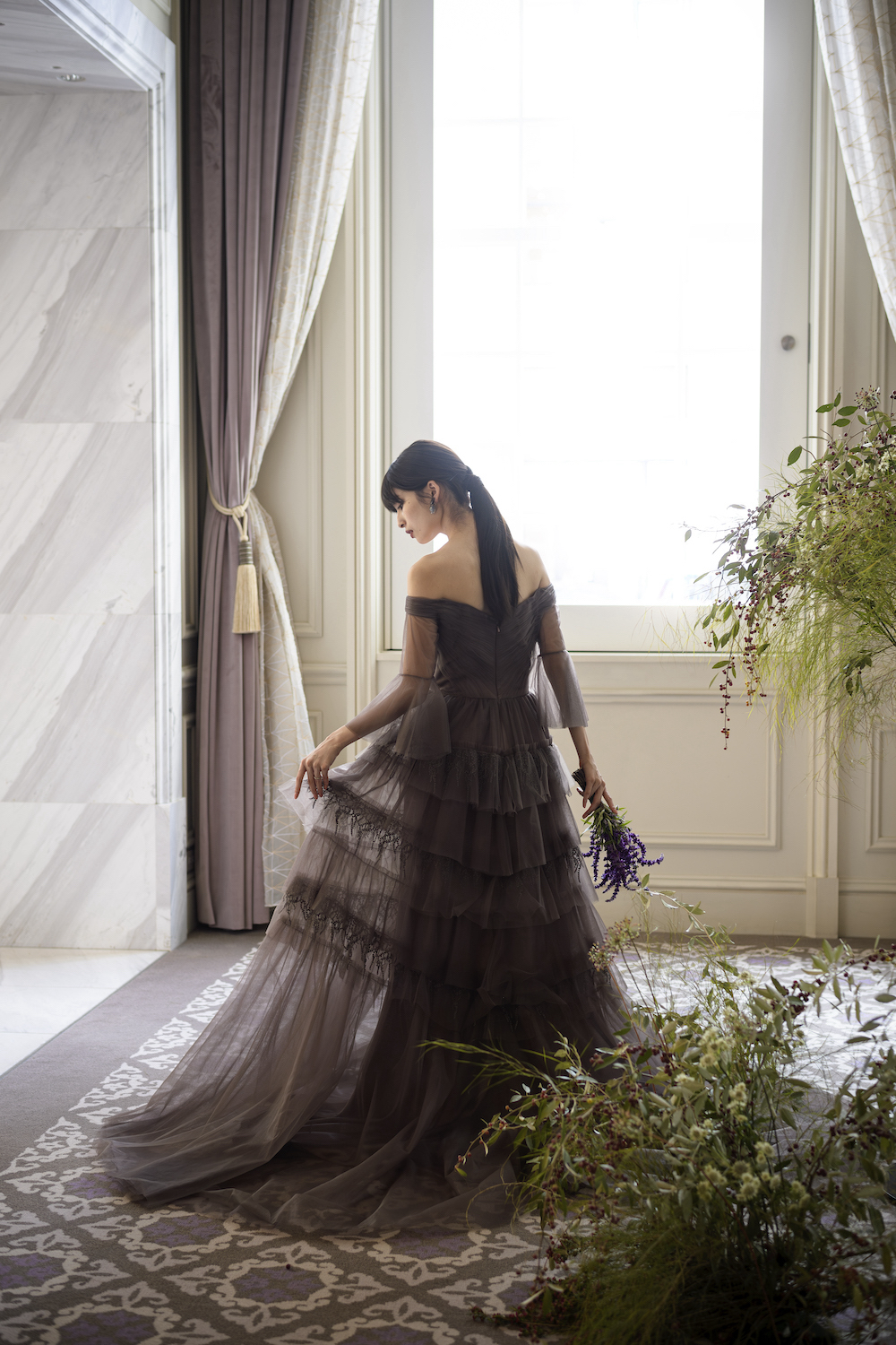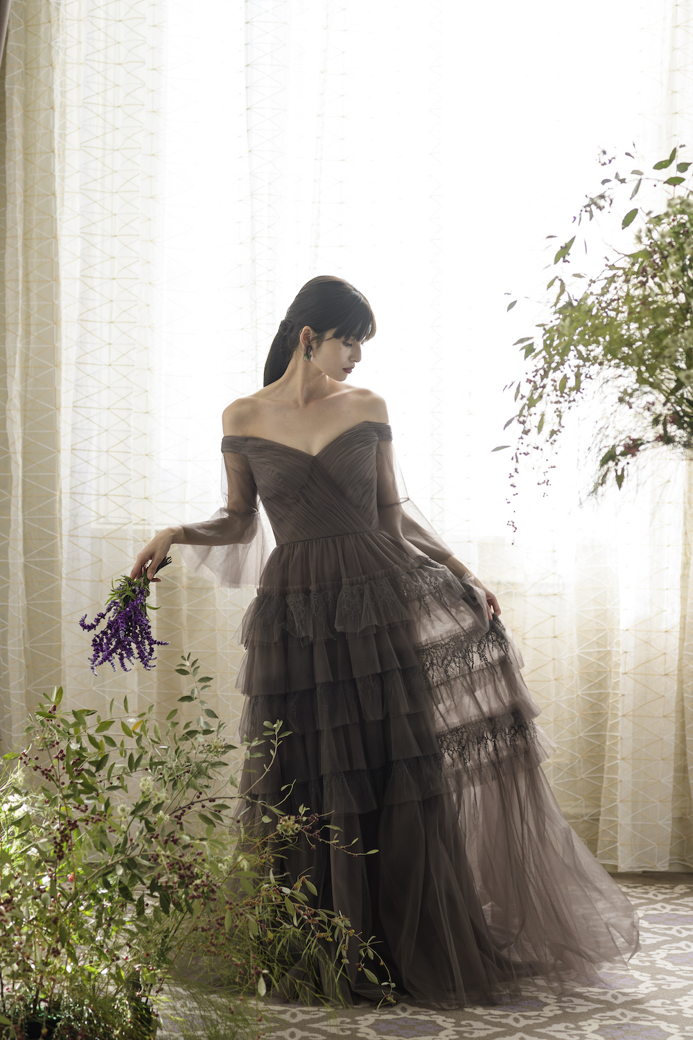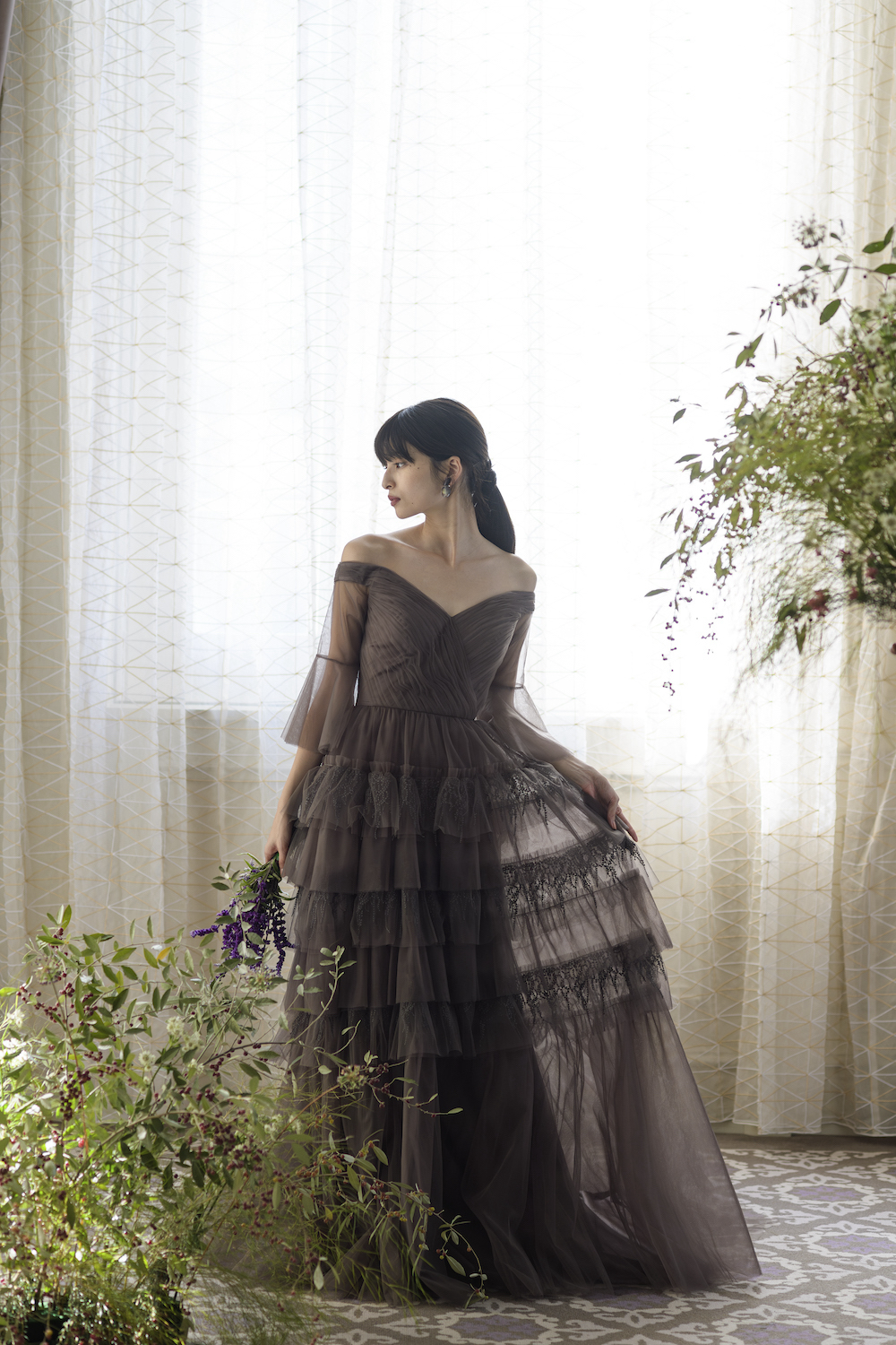 どこかノスタルジックでヴィンテージ感のあるセピアカラーのドレスは、幾重にもレイヤードされたチュールと