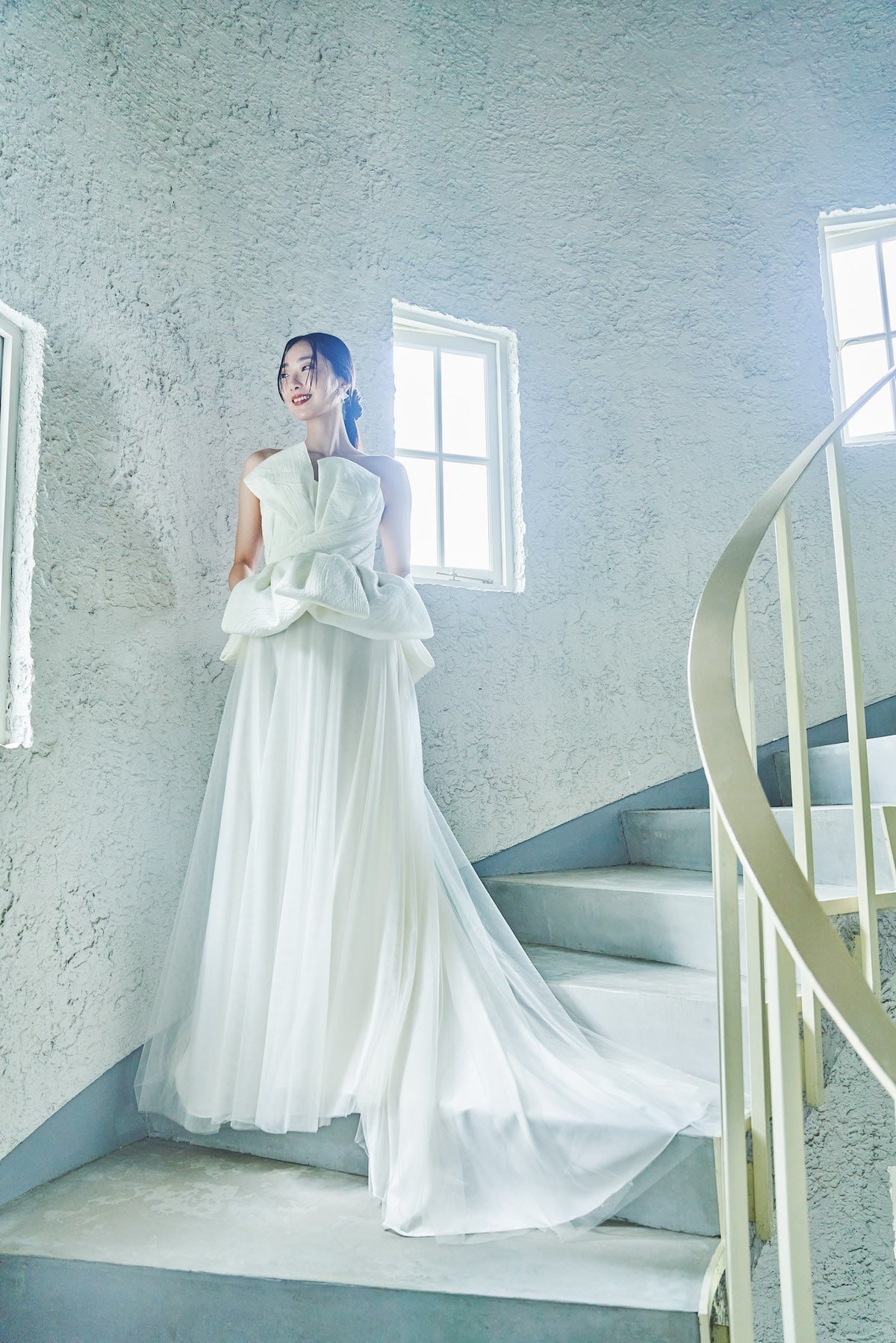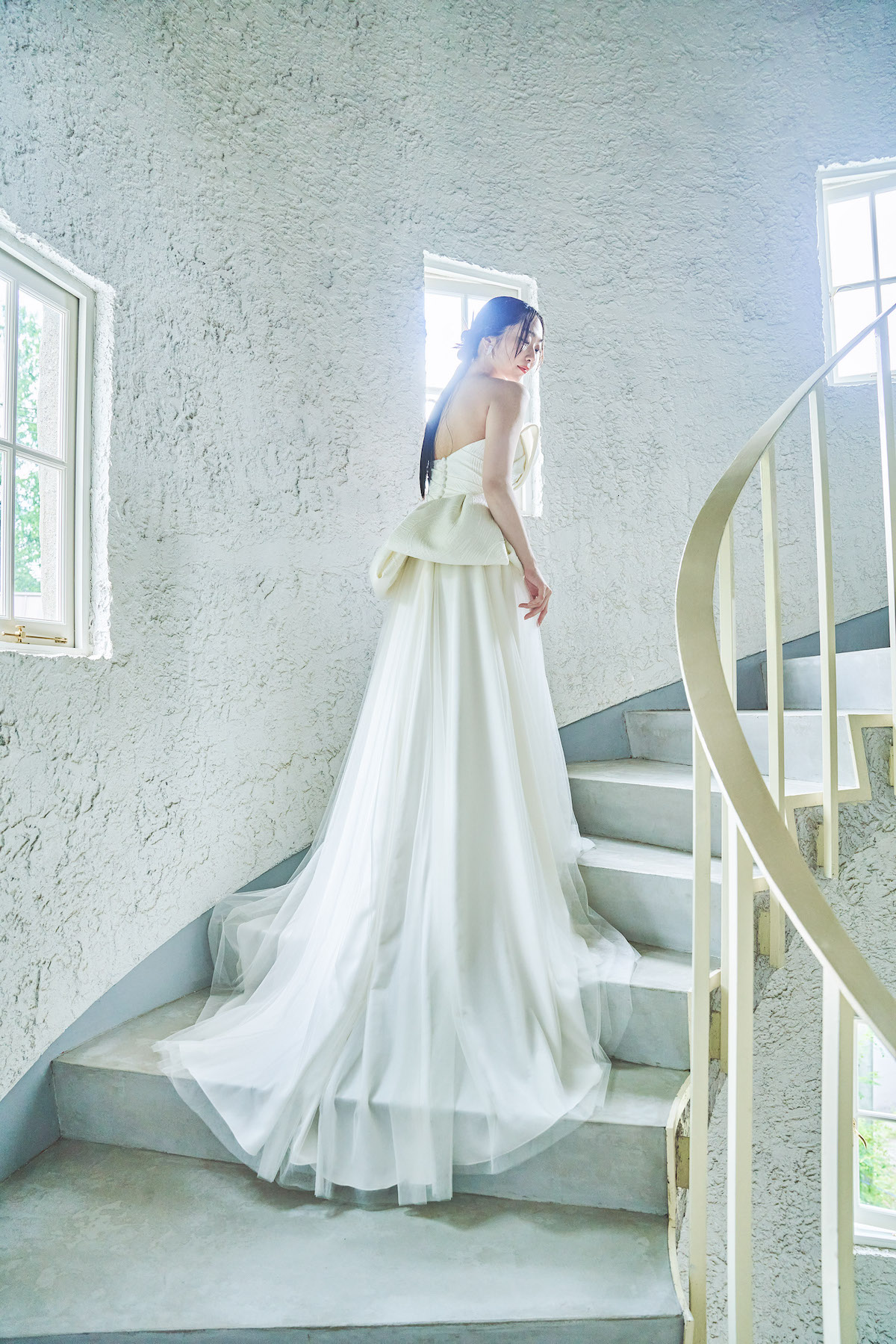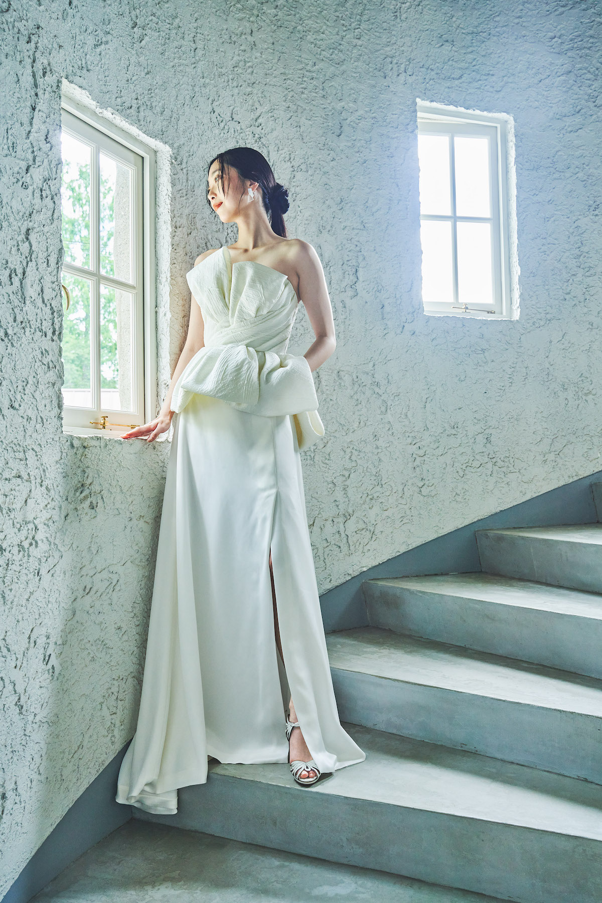 お着物の袂(たもと)や帯をインスピレーションに生まれたドレス。素材はスペインのアトリエで作られた、枯山水を思わせるような模様のジャカード生地を使用。トップスとスカートがセパレートになっており、組み合わせ方でコーディネートを楽しんでいただけます。スリットの入ったサテンスカートと、ジョーゼットのソフトマーメイドスカートからセレクトして、テクスチャーの異なるコントラストを楽しんでいただけます。