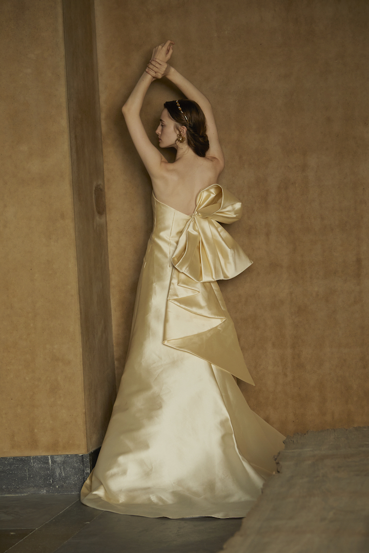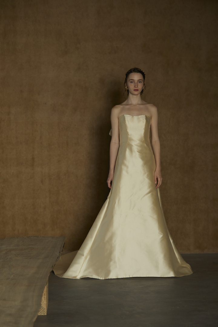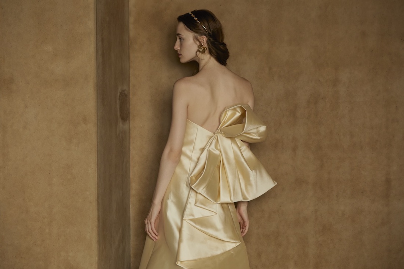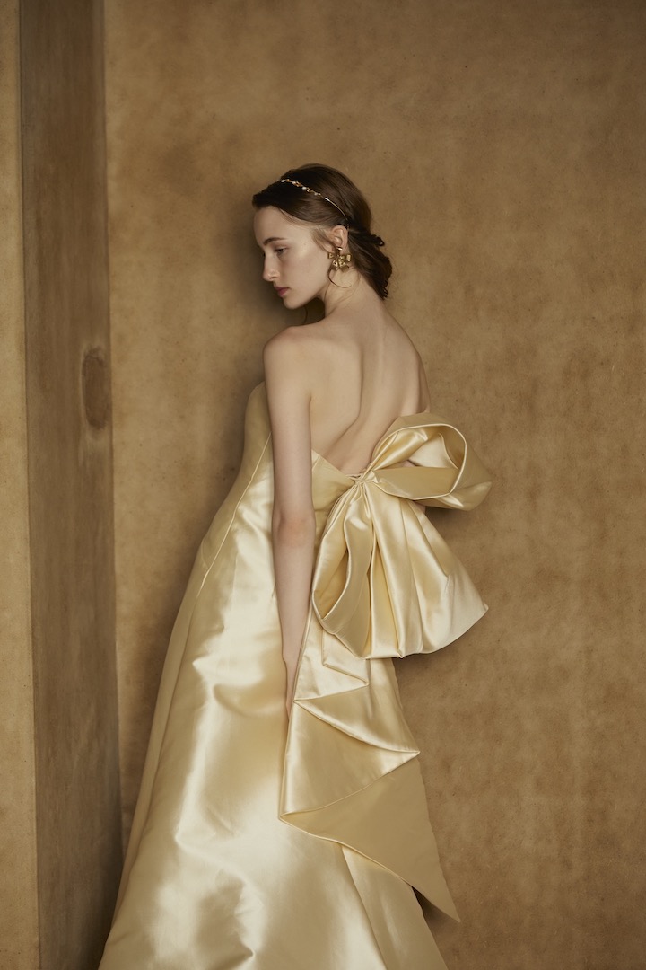 薄黄金色のスペイン製シルク混ミカド素材 上質さと軽やかさを体現したこの素材を纏うことで生まれる