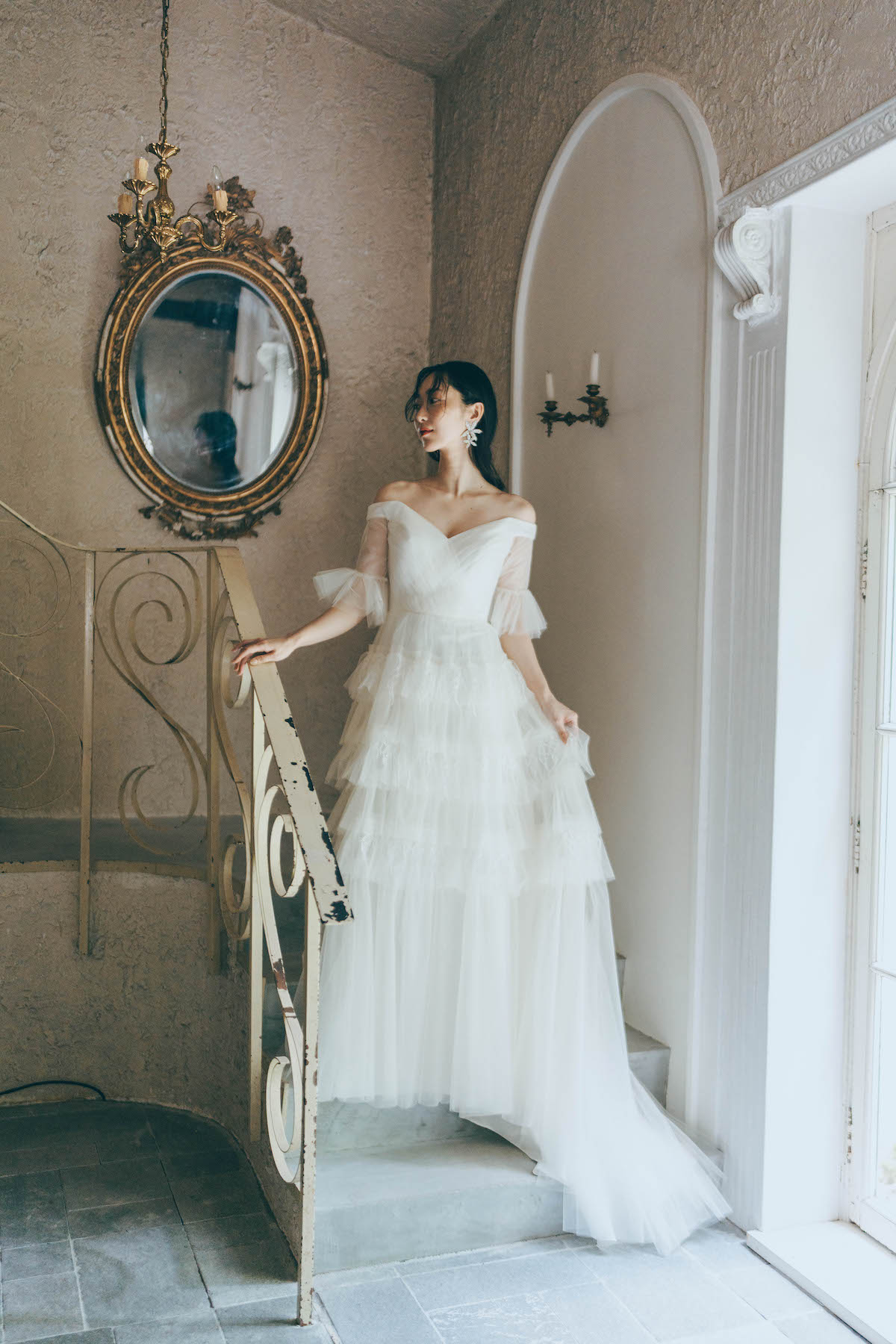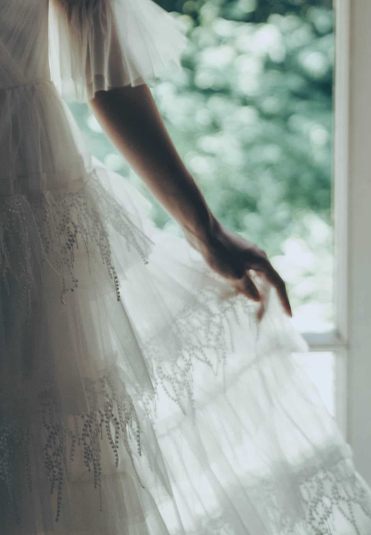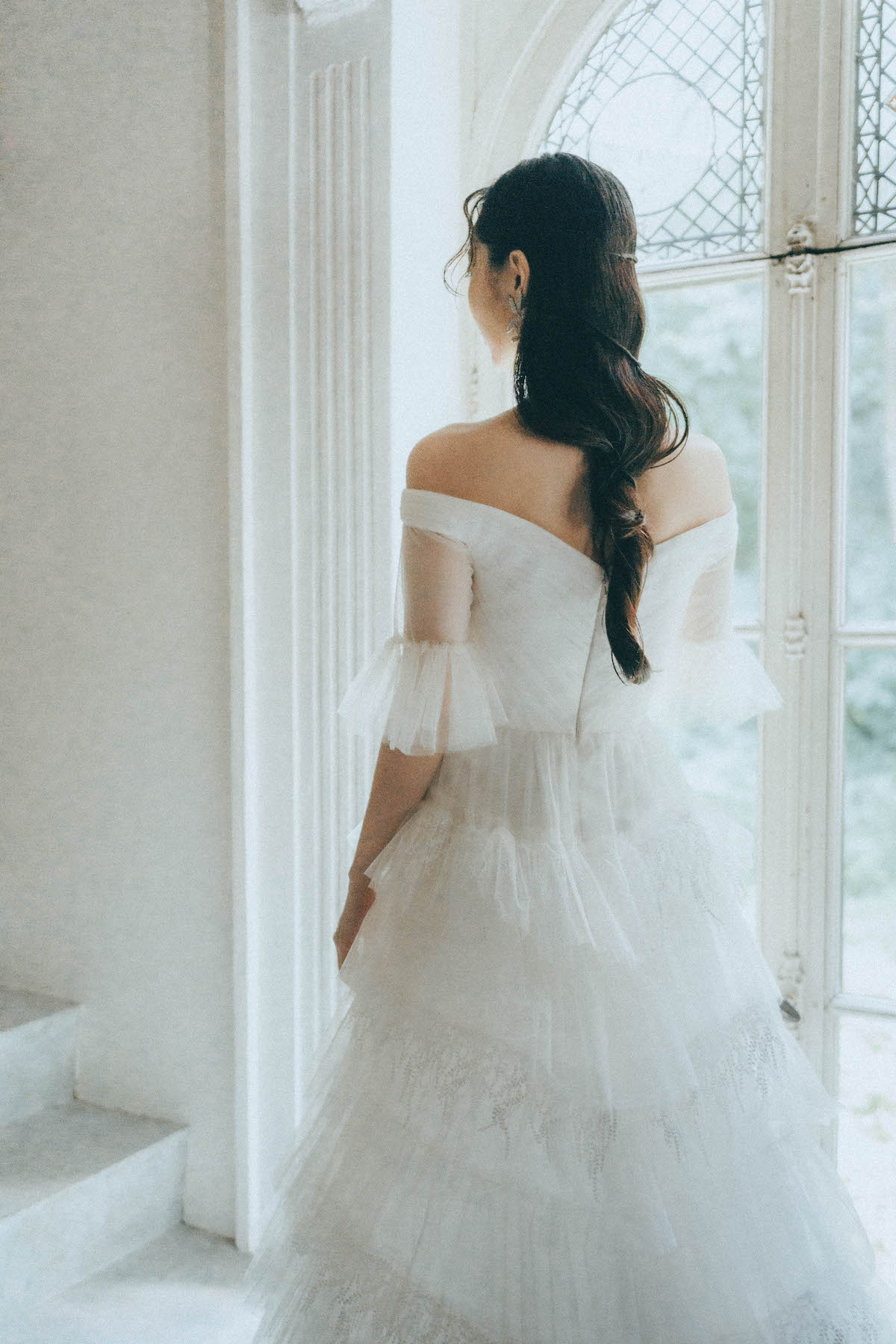 Snowberry 幾重にもレイヤードされたチュールと白い実がなるスノウベリーのようなレースが特徴。スノウベリーの花言葉は「いつまでも献身的に」。光を纏った時にレースが浮かび上がる姿が美しく、透明感溢れる1着。オフショルダーデザインが、上半身をすっきりとエレガントに魅せてくれる。 ご試着予約