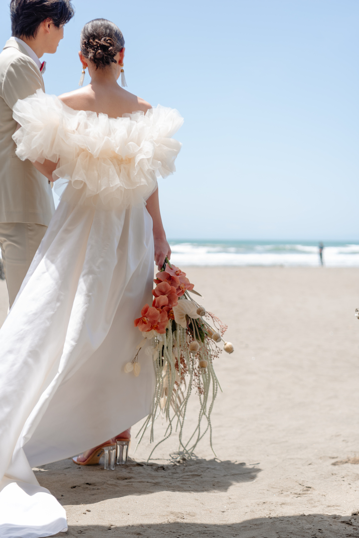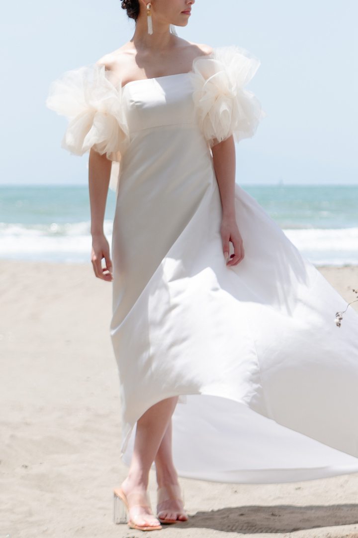 シルク混タフタの軽やかな素材をなびかせて、心からウェディングを楽しめる1着。