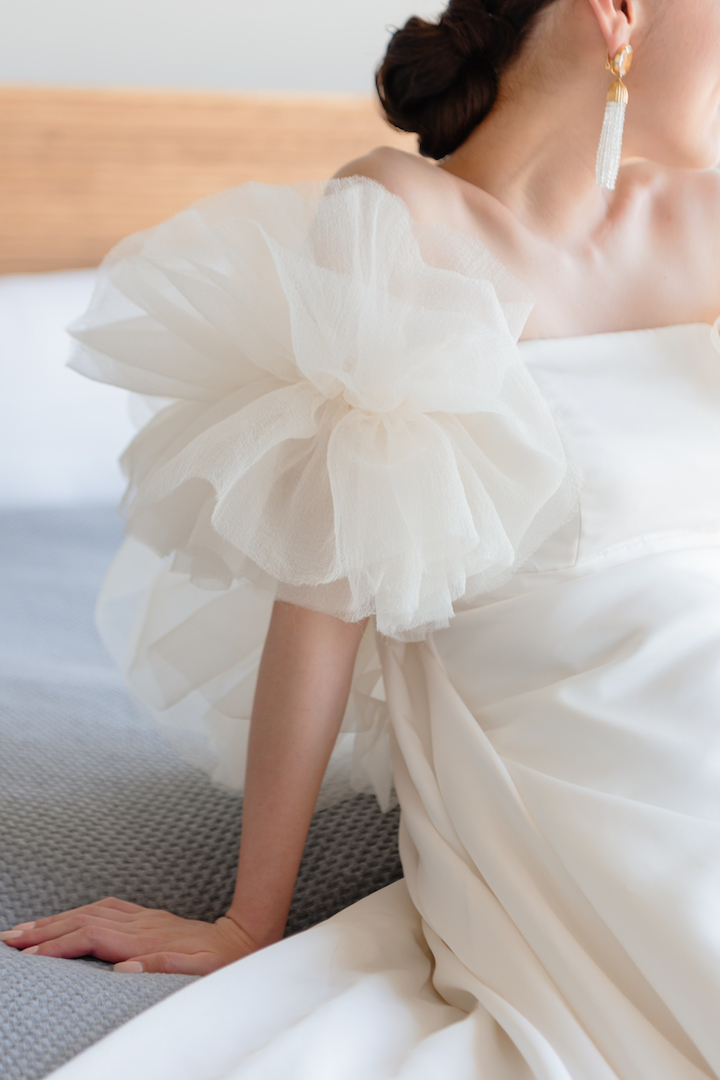まるで和紙のような手触りのオーガンジーで作られたショルダーとバックデザイン。