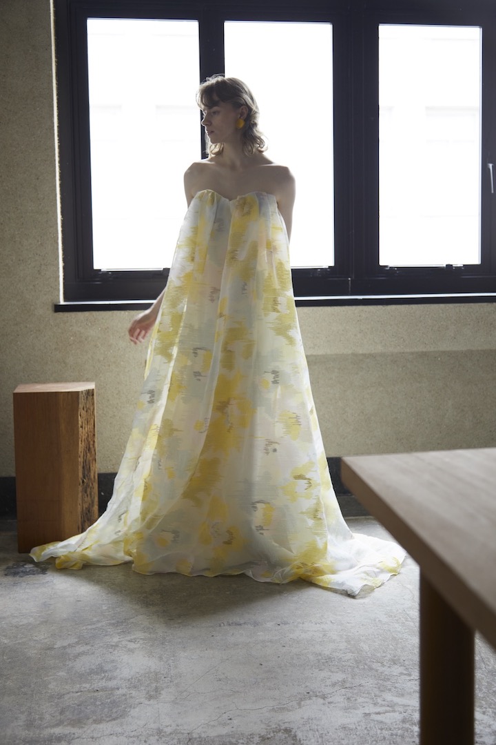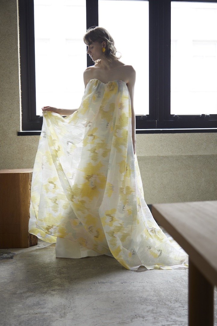 Twilight 黄金色に輝く 黄昏時の光を纏って アート作品のような黄金色の糸や銀糸が織りなすジャカード素材 透明感溢れるマテリアルは内側に纏ったマーメイドラインを 美しく包んでくれる。 光溢れる木漏れ日の中、また逆光やスポットを浴びた時にだけ その美しいシルエットが_見え隠れするダブルシルエット まるで黄昏時を纏ったような1着 ご試着予約