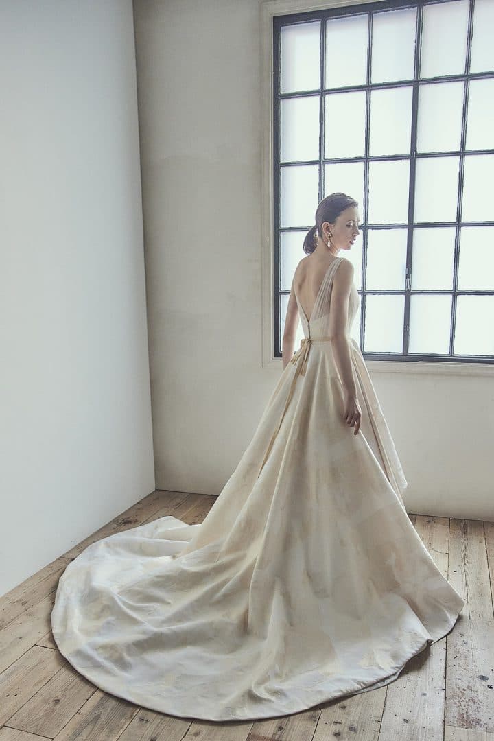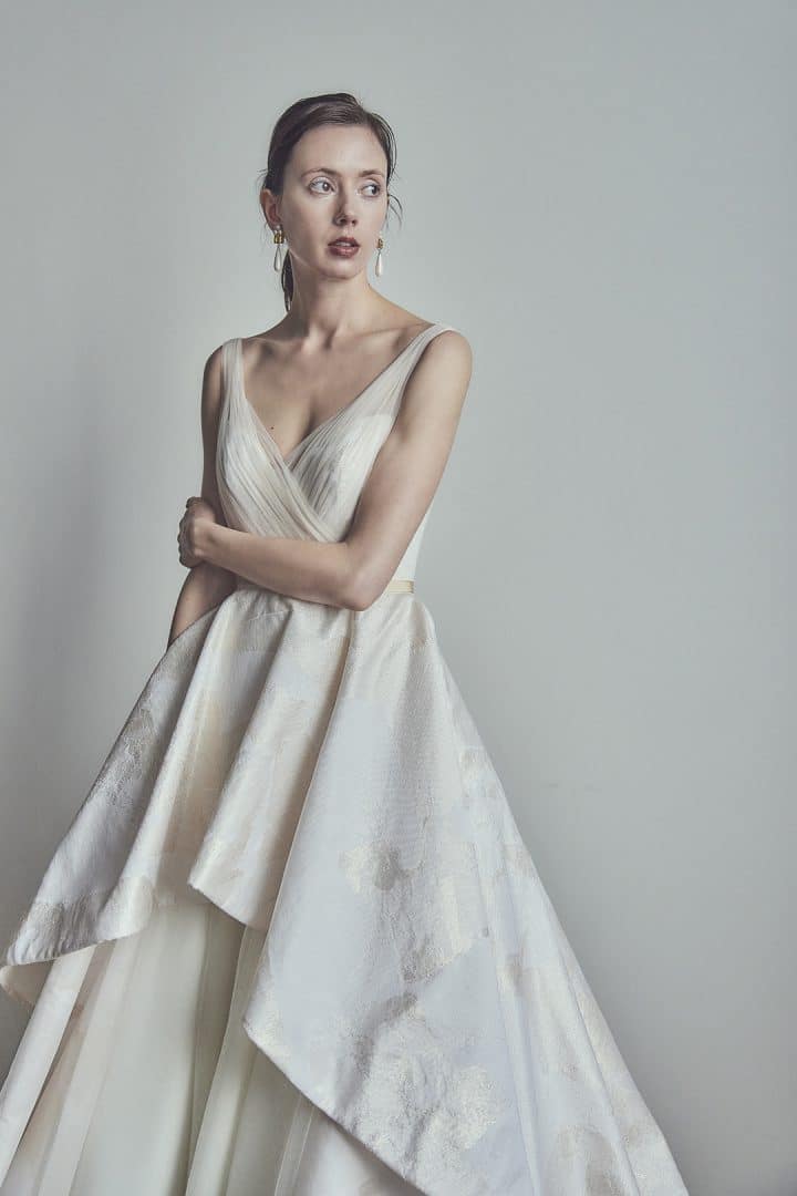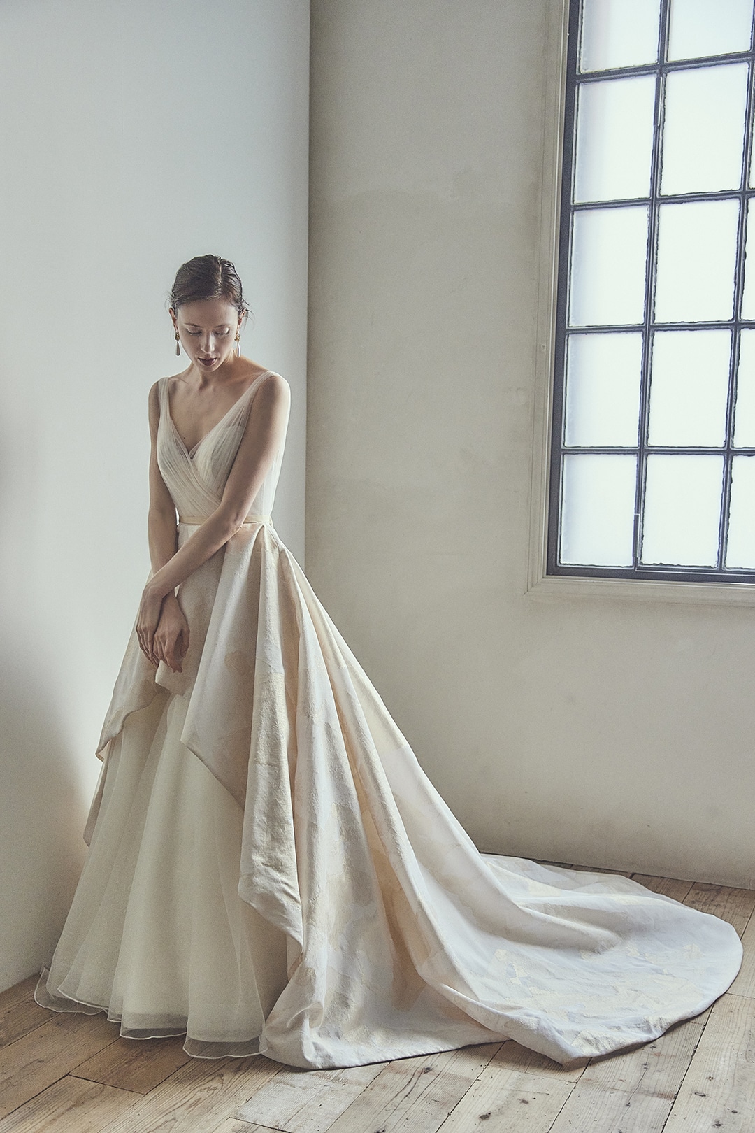 Yubae 動いた時にさりげなく表現される輝きが美しく慎ましい日本の花嫁らしさを演出してくれる 老舗〈細尾〉の西陣織りをスカートに贅沢に取り入れたドレス。 まるで金箔のような、金糸で織られた立体感のあるデザインが特徴的。 インナースカートはチュール素材やスパンコール素材が上品な華やかさをもたらす。 さりげなくリンクさせた光沢が、所作によって美しく表現された1着。 ご試着予約