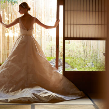 ituwaのファーストコレクション「花鳥風月」から、西陣織を使用したドレスを3着ご紹介します。京都西陣で元禄元年に創業した細尾(HOSOO)のテキスタイルを使用しています。
